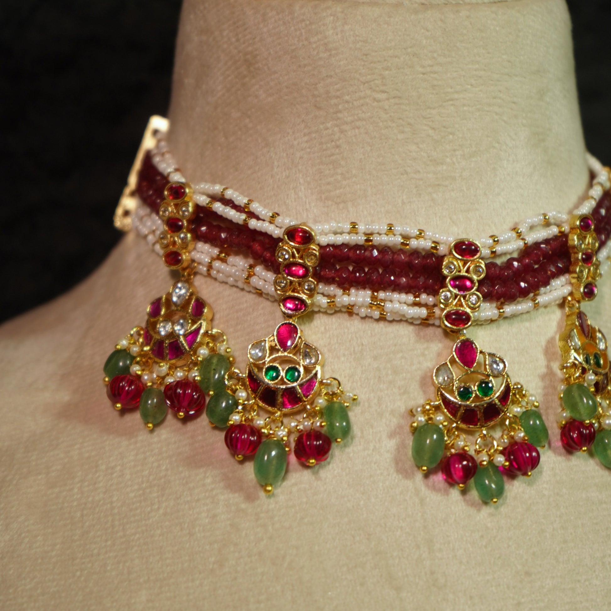 This handcrafted Jadau Kundan choker features intricate traditional detailing that reflects timeless royal elegance. Adorned with rich ruby-toned stones and graceful emerald green bead drops, it is beautifully layered with delicate pearl strands for an added touch of refinement. Inspired by classic Rajwada heritage aesthetics, the elegant hanging motifs enhance its regal charm, making it a perfect choice for festive and bridal occasions.